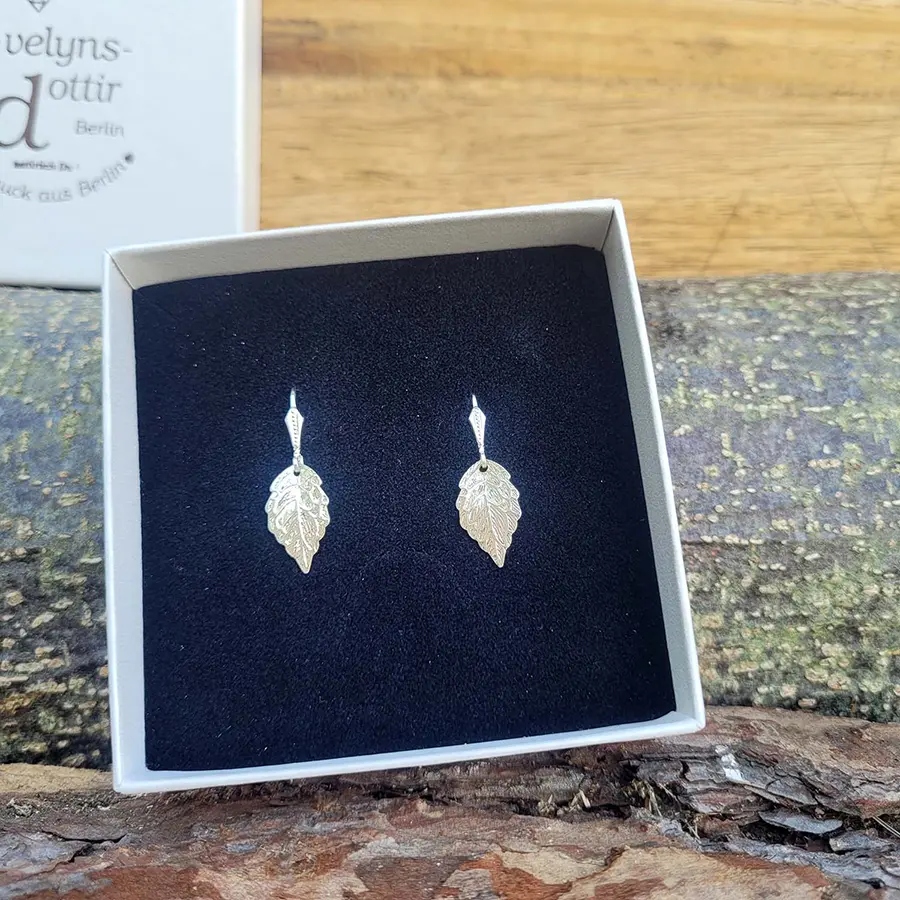 Die zarten Blätter sind versilbert und fein gearbeitet. Sie sind so filigran gearbeitet, dass sie wie echte kleine Blätter aussehen. Sie hängen an echt silbernen Brisuren, die mit kleinen, silbernen Rauten verziert sind. Hübsche, kleine Ohrringe, die Deine Natürlichkeit unterstreichen.