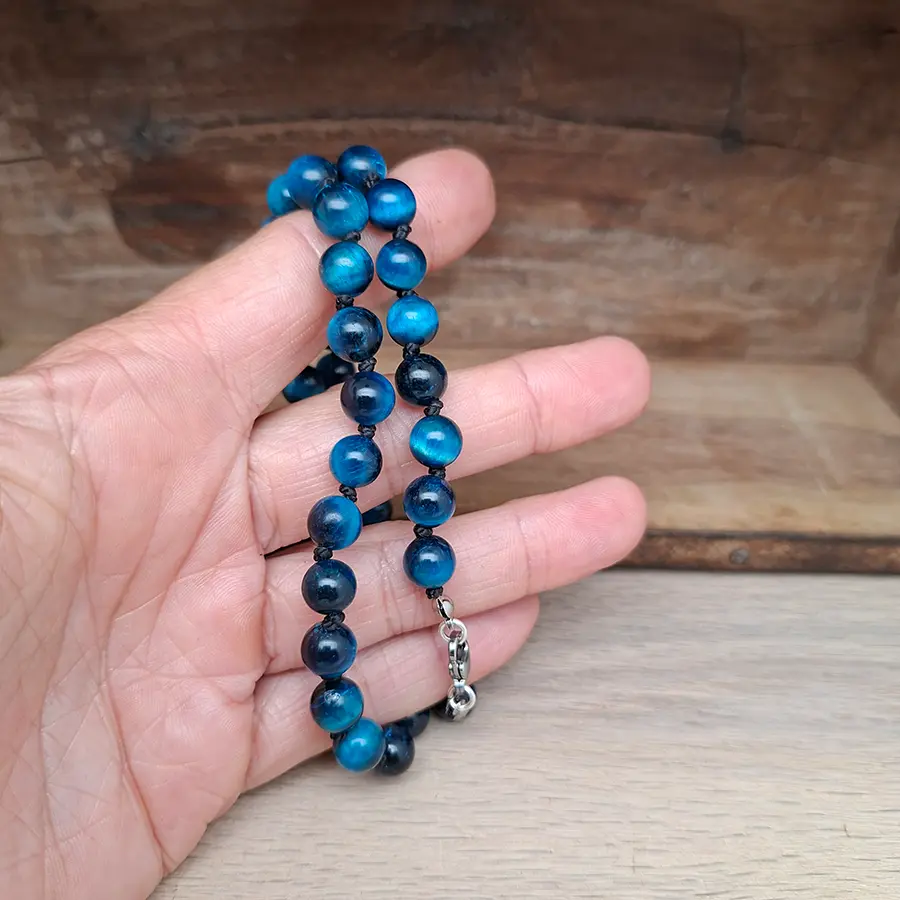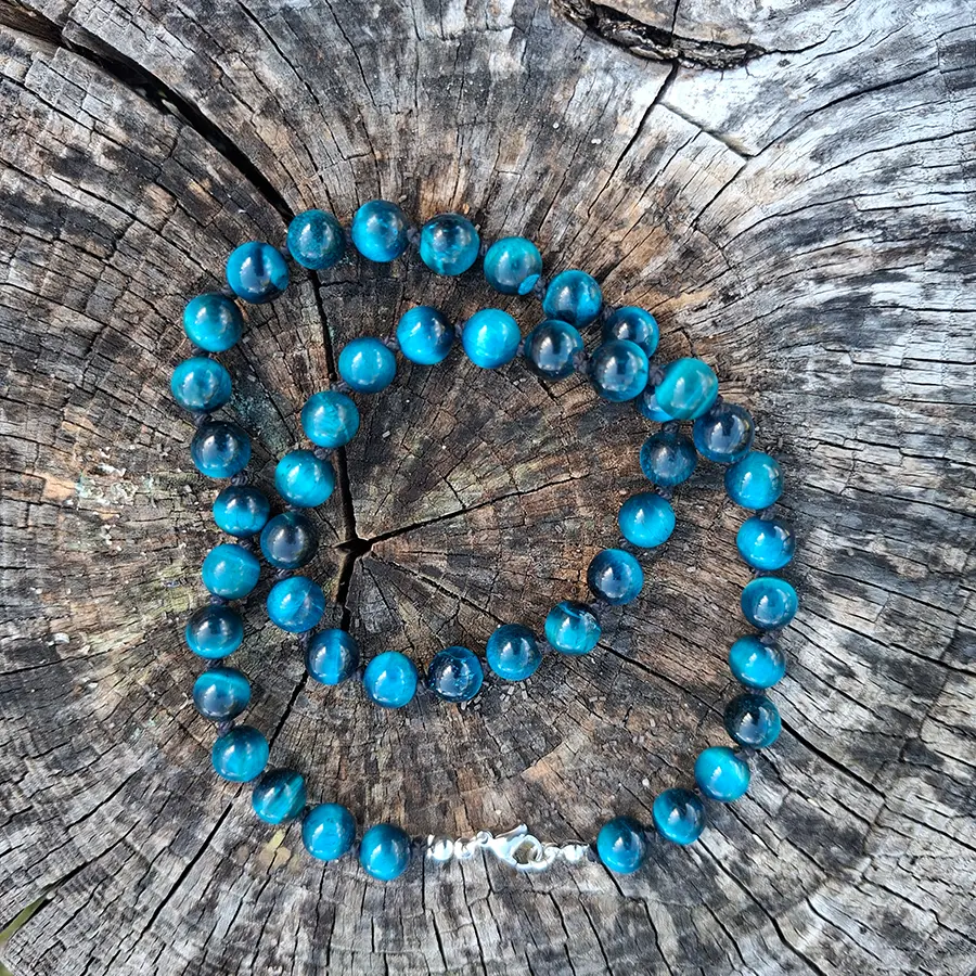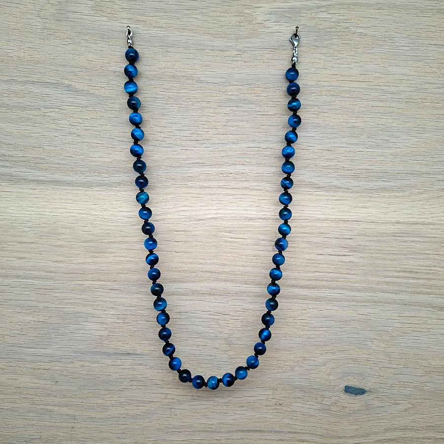 Handgeknüpfte blaue Perlenkette aus Tigerauge, ein wunderschönes Unikat!