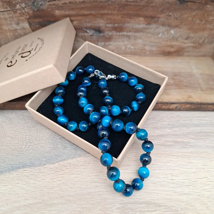 Die Kugeln aus echtem Tigerauge wurden hochwertig blau eingefärbt, wodurch ihr faszinierendes Farbspiel besonders schön zur Geltung kommt. Jeder Stein schimmert einzigartig in intensiven Blautönen mit natürlicher Tiefe.