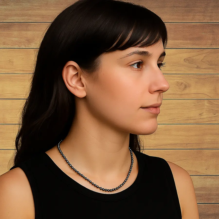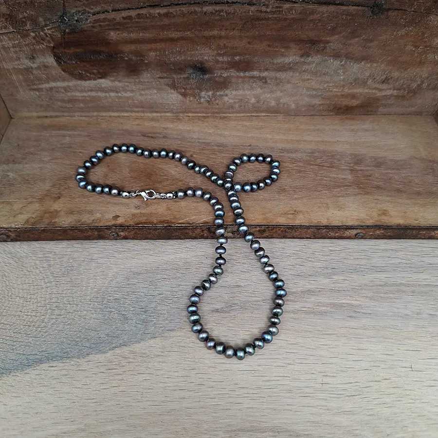 Ein changierendes Blaugrau mit feinen Momenten von Violett – je nach Licht wirkt jede Perle ein wenig anders und verleiht der Kette einen subtilen, fast mystischen Glanz.