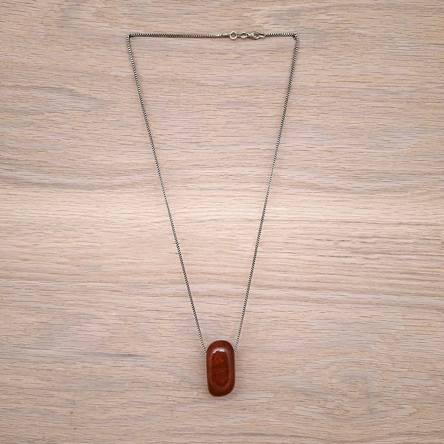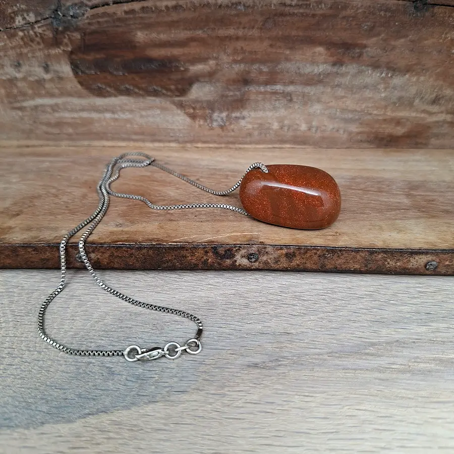 Diese elegante Halskette besteht aus einer feinen, ca. 54 cm langen Venezianerkette aus echtem Silber. Im Mittelpunkt steht ein wunderschöner Goldfluss-Stein in einer Größe von etwa 18 x 35 mm – warm schimmernd, sanft abgerundet, der durch sein samtiges Glitzern sofort ins Auge fällt.