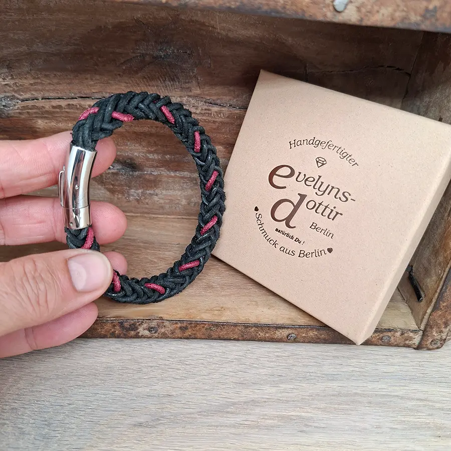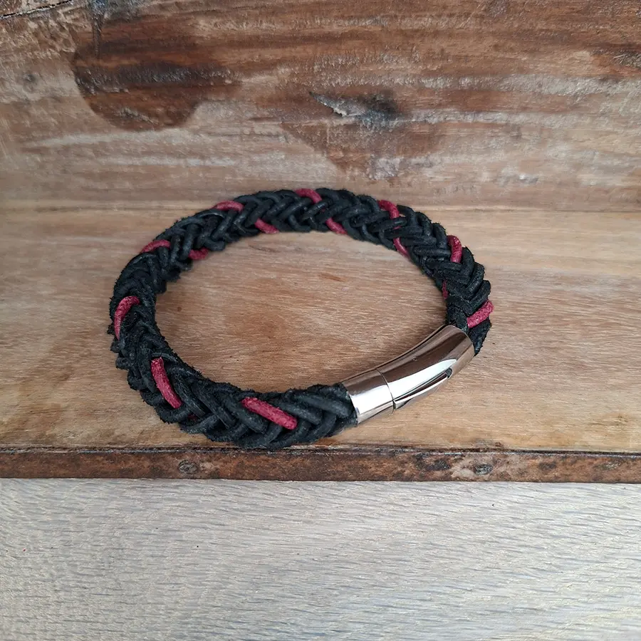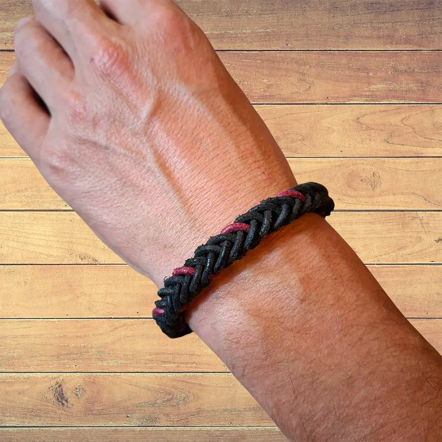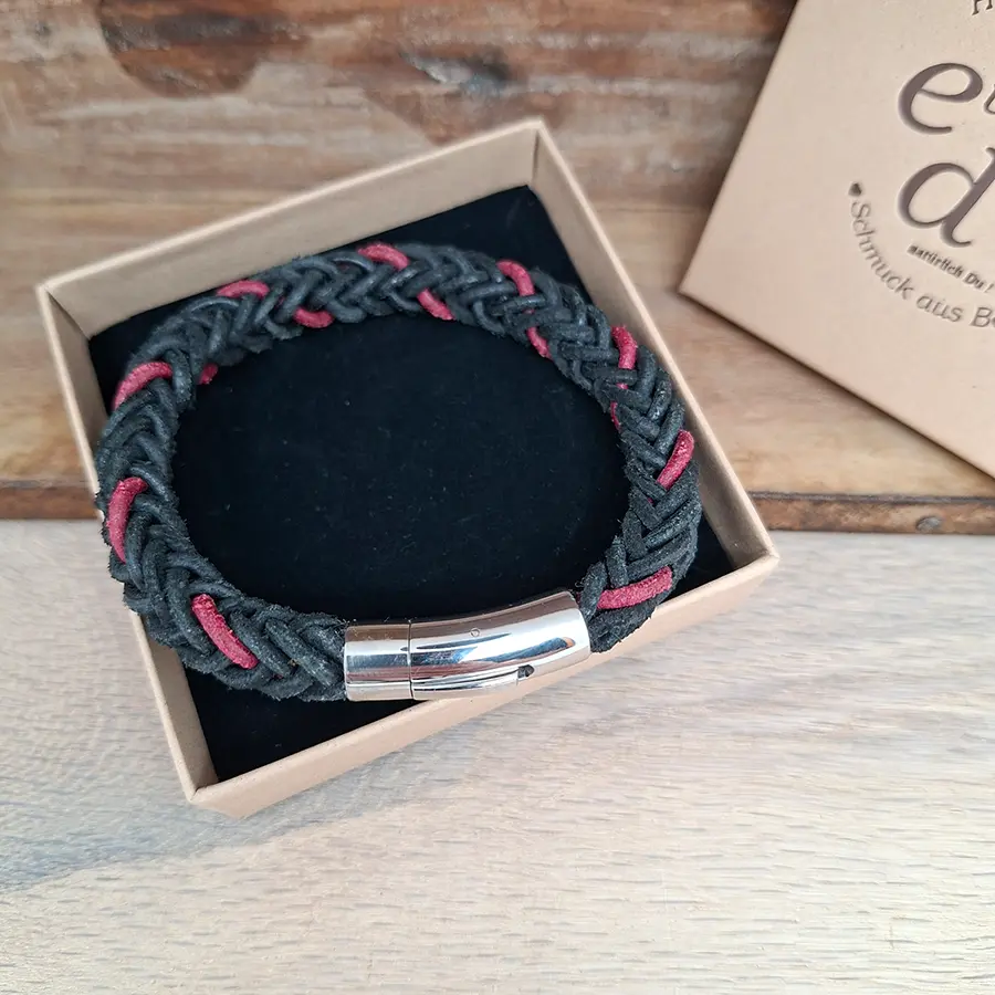 Dieses handgemachte Armband vereint maskuline Eleganz mit sportlichem Charme. Es wurde aus sechs Strängen hochwertigen Büffelleders in den Farben Schwarz und Weinrot geflochten – robust, flexibel und angenehm zu tragen.