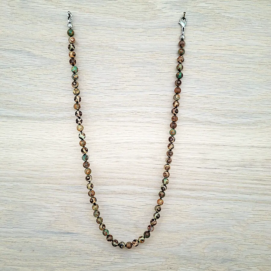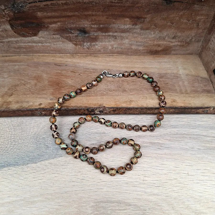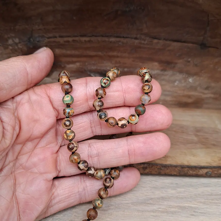 Diese Kette besteht aus runden Augenachat-Perlen, die durch ihre besonderen Muster an die traditionellen tibetischen Dzi-Perlen erinnern. Jedes Stück zeigt natürliche Farbverläufe in Braun-, Beige- und Grüntönen mit den charakteristischen „Augen“, die seit Jahrhunderten als Symbol für Schutz und Stärke gelten. Es handelt sich um moderne, kunstvoll bearbeitete Achat-Perlen – inspiriert von antiken Vorbildern, aber in einer zeitgemäßen Ausführung.